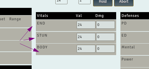 I marked in Blue what should be the max BODY and STUN and in Red should be the current.